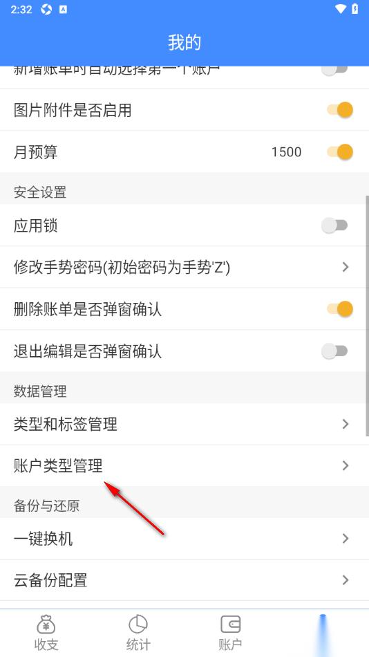 2.在当前打开的窗口中,选择显示的【账户类型管理】功能,将其点击打开。