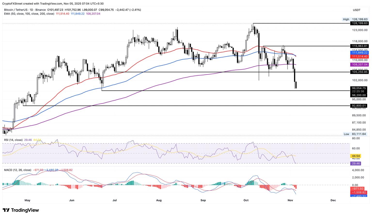 截至周三发稿时,比特币交易价格跌破 10 万美元,连续第三个交易日下跌。50 日指数移动平均线 (EMA) 和 100 日 EMA 的死叉确认了短期空头主导地位。
