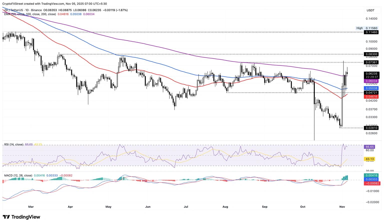 截至发稿时,ZK 周二交易价格高于 0.0600 美元,守住了 200 日均线,并维持了上周 80% 的涨幅。如果该治理代币跌破 200 日均线,则可能下探 100 日均线,接近 0.05000 美元的心理关口。