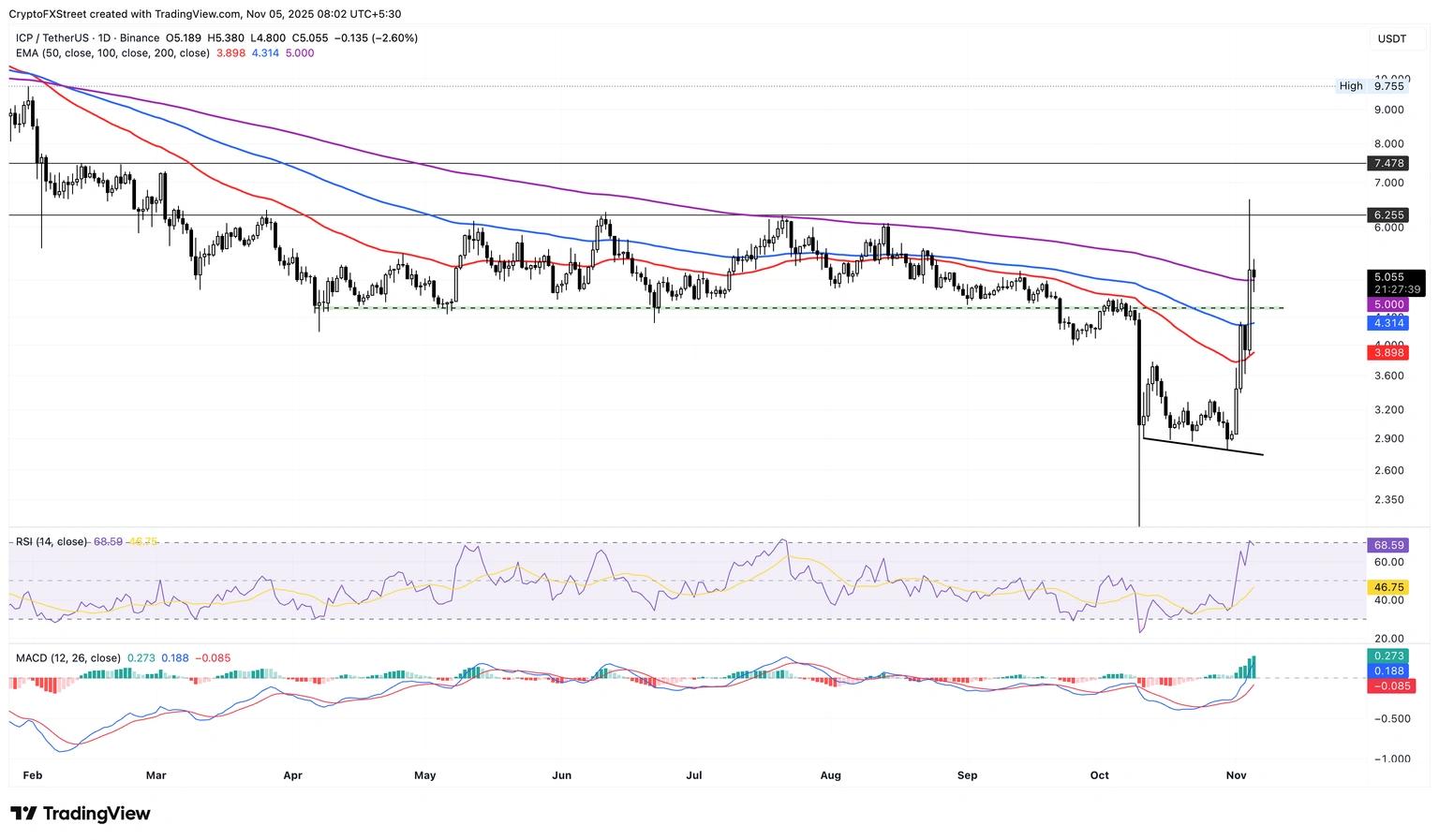截至周三发稿时,Internet Computer (ICP) 股价小幅下跌近 4%,测试 5 美元关口和 200 日均线。如果 ICP 股价最终跌破该均线,则可能进一步下探至 4.311 美元的 100 日均线。