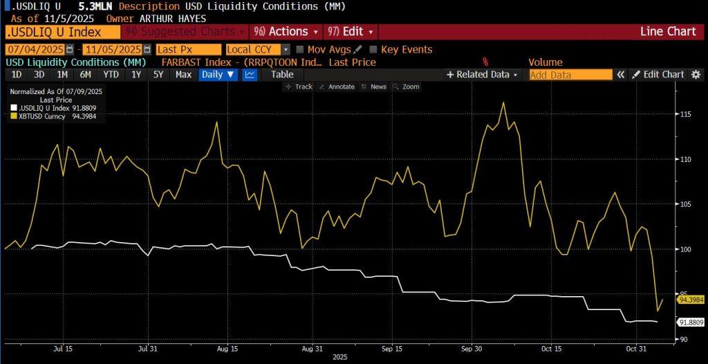 此次下跌正值美元流动性收紧之际,这降低了整个金融市场的风险偏好。流动性收缩——这一趋势历来与比特币的表现同步——正在给加密货币市场带来宏观压力。