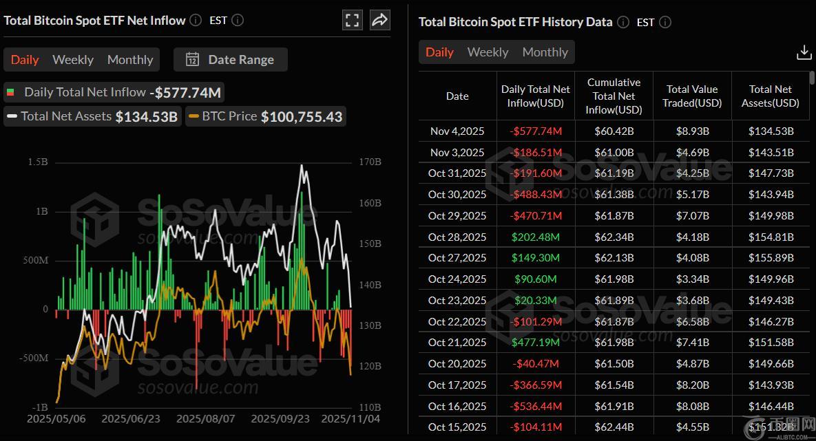 迄今为止,机构对比特币的需求持续减弱。本星期SoSoValue数据显示,现货比特币ETF周二录得5.7774亿美元的资金流出,延续了自10月29日以来的每日资金流出趋势。此次流出是自8月初以来单日最高纪录。如果资金流出持续并加剧,比特币的价格回调可能会延长,表明机构投资者信心下降。