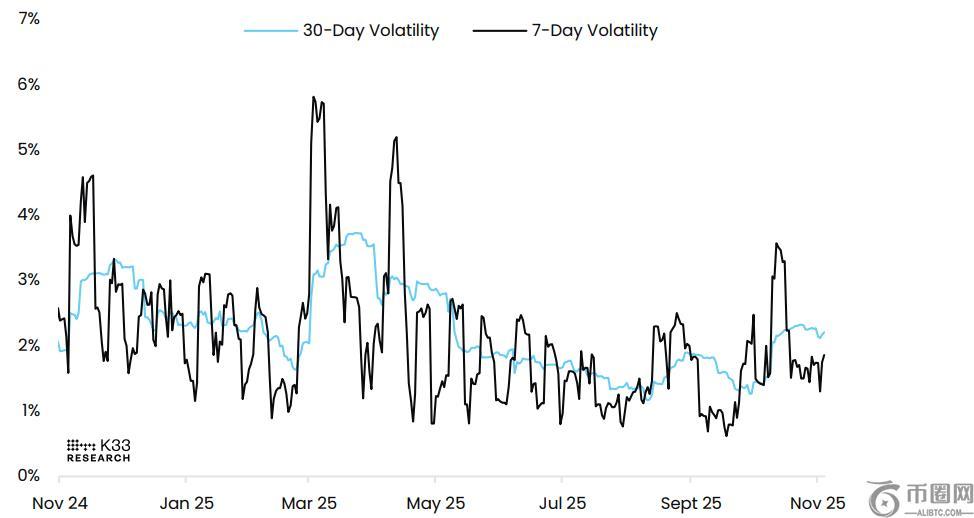 K33 Research 周二发布的一份报告指出,比特币近期的价格调整是以一种稳定有序的方式进行的,短期波动性没有出现大幅飙升。