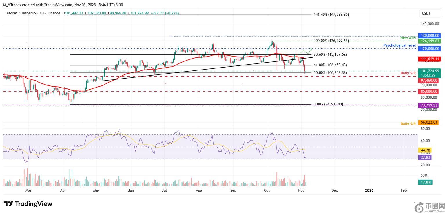 比特币价格周一,比特币价格在此前跌破的趋势线附近遭遇阻力,下跌8.18%,并在第二天回落,重新测试了100,353美元的50%回撤位。截至周三发稿时,比特币在100,353美元附近获得支撑,交易价格略高于101,000美元。
