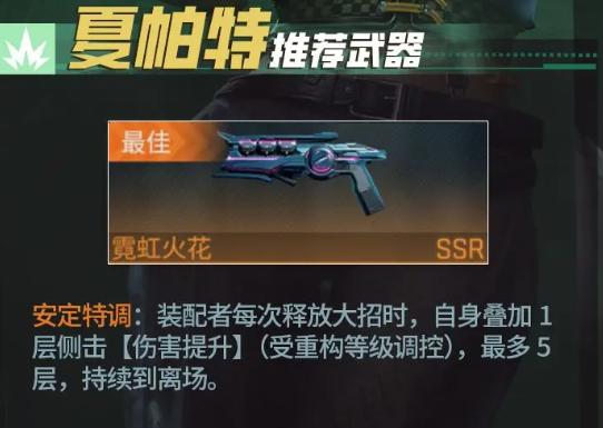 绝佳的武器就是霓虹火花,这把武器的效果还是很厉害的,在每一次释放大招之后都可以提升侧击的伤害,最多就可以叠加5层效果也可以一直持续到夏帕特离场。不管夏帕特是走侧击流又或者是大招流,那侧击都是很重要的伤害。在叠满5层之后,侧击的伤害就会有明显的飞跃,后期养成越深入,那输出也就会更猛。