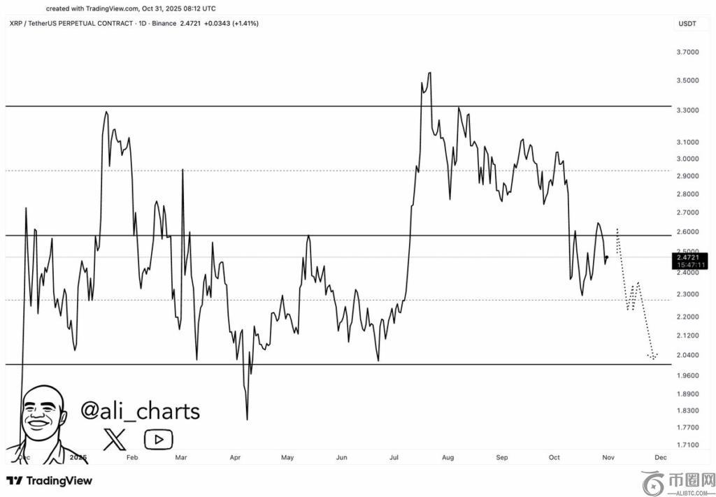 另一方面,分析师阿里·马丁内斯此前曾预测 XRP 价格将暴跌至 2 美元。随着今天的下跌,这位分析师指出,瑞波币的主要支撑位目前在 2 美元。