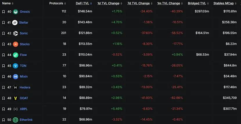 XRPL公链方面,作为Ripple的技术核心,其已服务全球500多家金融机构,年化交易量接近950亿美元。XRPL近期升级引入EVM兼容侧链,并与Polygon CDK合作,提升了智能合约功能。XRPL的DeFi生态相对滞后,DefiLlama数据显示,XRPL DeFi TVL仅7959万美元(排名第49),远不及Solana 101亿美元和以太坊747亿美元等主流公链。