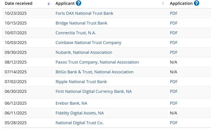 二是美国银行牌照申请,Ripple于2025年7月2日 向美国货币监理署(OCC)提交设立Ripple National Trust Bank的申请,目前处于120天法定审查期,最晚将于2026年11月2日 前出初步结果。根据OCC官网最新状态,Circle(First National Digital Currency Bank)于6月30日申请,已超120天审查期,仍未获批 ;Paxos于8月12日申请,审查中 ;Coinbase于10月3日申请,审查中。