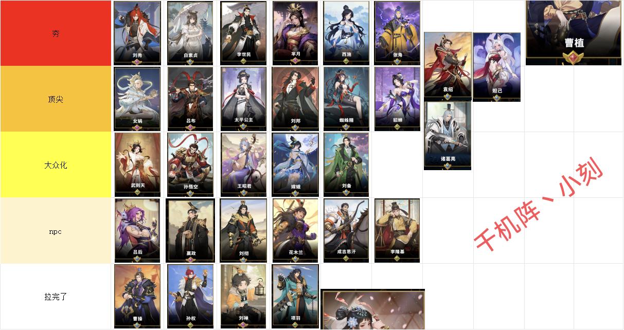 前排:一号位可以上守卫相柳,既能针对白起和霍去病,又能腾个格子。白象精至少上一个,金卡银角上一个,牛魔王也行,收益预期都差别不大。