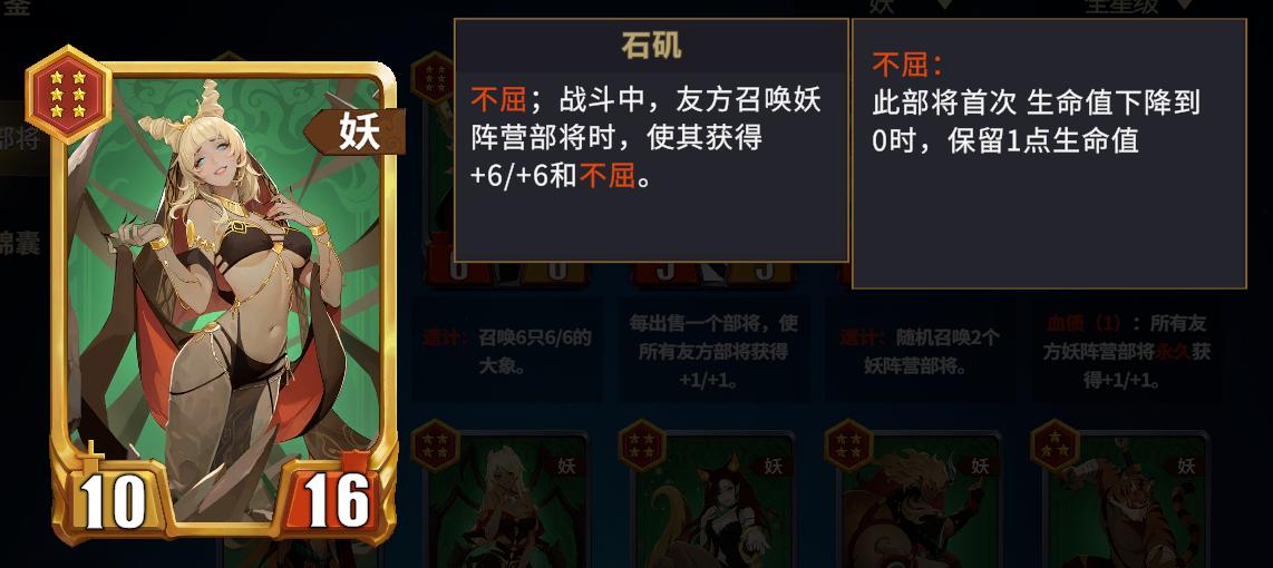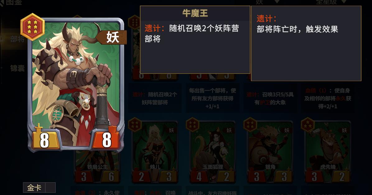 6星牛魔王:召唤随机2个妖族牌。不包含自身共计17张妖族牌,其中白板卡有9张,毒药1张,不屈3张,守卫1张,带遗计召唤物的牌4张,一半的概率出白本,收益一般,6星性价比低。