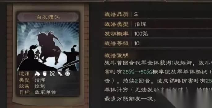 开荒的时候可以免疫非常多的伤害。然后就是在战斗中自身一旦造成兵刃伤害,则会有百分之五十的概率进行两回合的单体缴械。造成谋略伤害,则是有百分之五十概率使敌军进入单体技穷一回合。也就是说如果拿一个文武双全的技能,这种战法打出去。如果运气好,可以打一个单体缴械,然后打一个单体技穷。两回合的缴械,一回合的技穷,看似控制很足。但是就目前版本来说,适合吕蒙的战法实在是太少。其中有一个非常好的战法叫做火炽原燎,给吕蒙用还算是比较不错的。