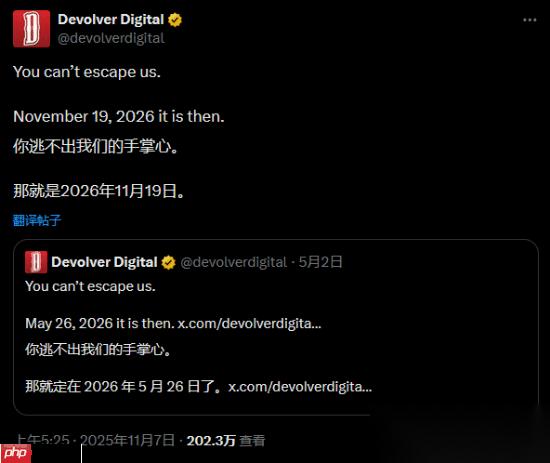 随后在5月2日,《GTA6》首次宣布跳票至2026年5月26日,Devolver立刻转发原推并写道:“你躲不掉的。那就2025年5月26日见。”