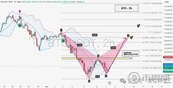 BTC目前走的2h深二探剧本,关键是要突破站稳颈线104500,同时也是2h布林上轨压力位,有效突破这里才能看站稳冲击蝙蝠形态。
