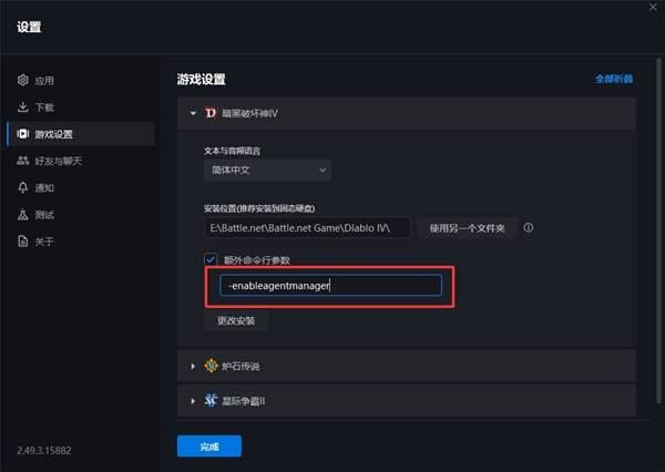 (4)在战网客户端——>游戏设置——>暗黑破坏神4——>勾选额外命令行参数,添加下列参数后点击完成按钮:-enableagentmanager(注意这个-前面要加一个空格)