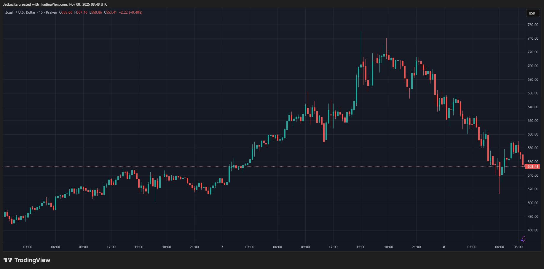 截至发稿时,Zcash 的交易价格为 580.67 美元,已从盘中高点 734.96 美元回落。