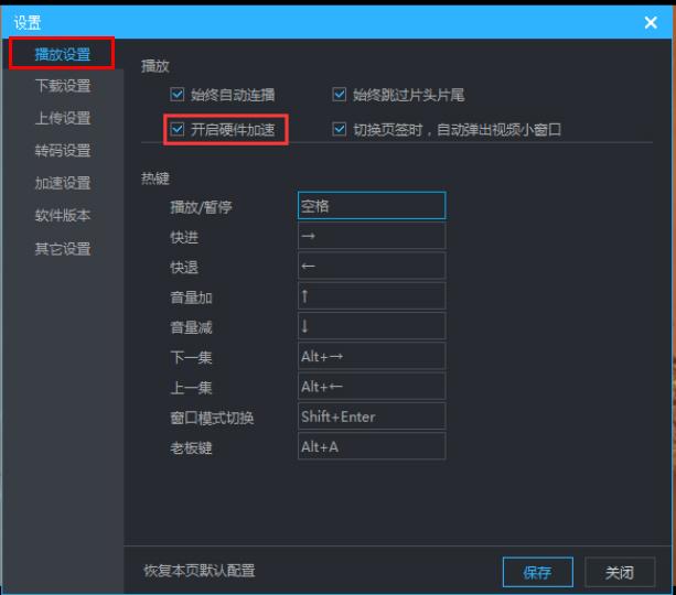 2、在打开的窗口界面中,点击左侧中的"播放设置"选项,这时可以看到右侧中的"开启硬件加速"被勾选上了。