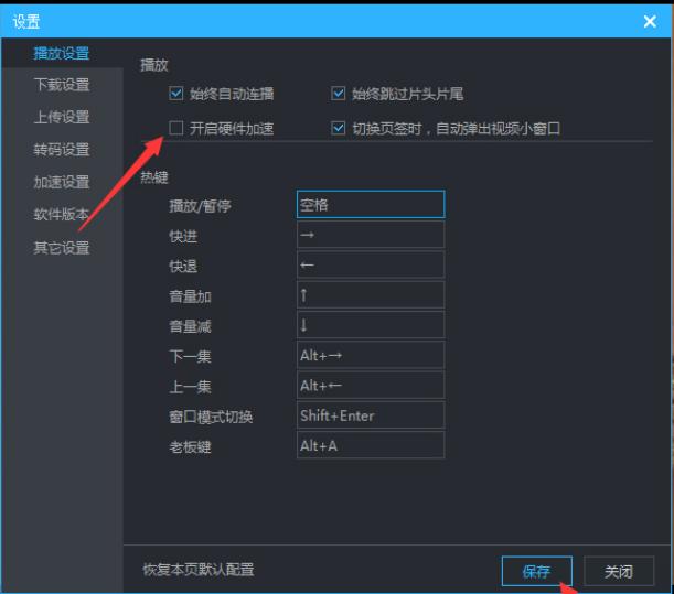 3、然后将"开启硬件加速"小方框取消勾选,最后点击下方中的保存即可。