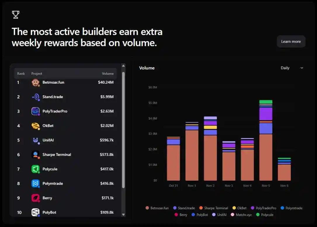 Polymarket 似乎在帮助扩大构建者应用的范围,从交易终端到 AI 助手,并且还创建了类似 Hyperliquid 的仪表盘,用以展示顶级构建者及其奖励。