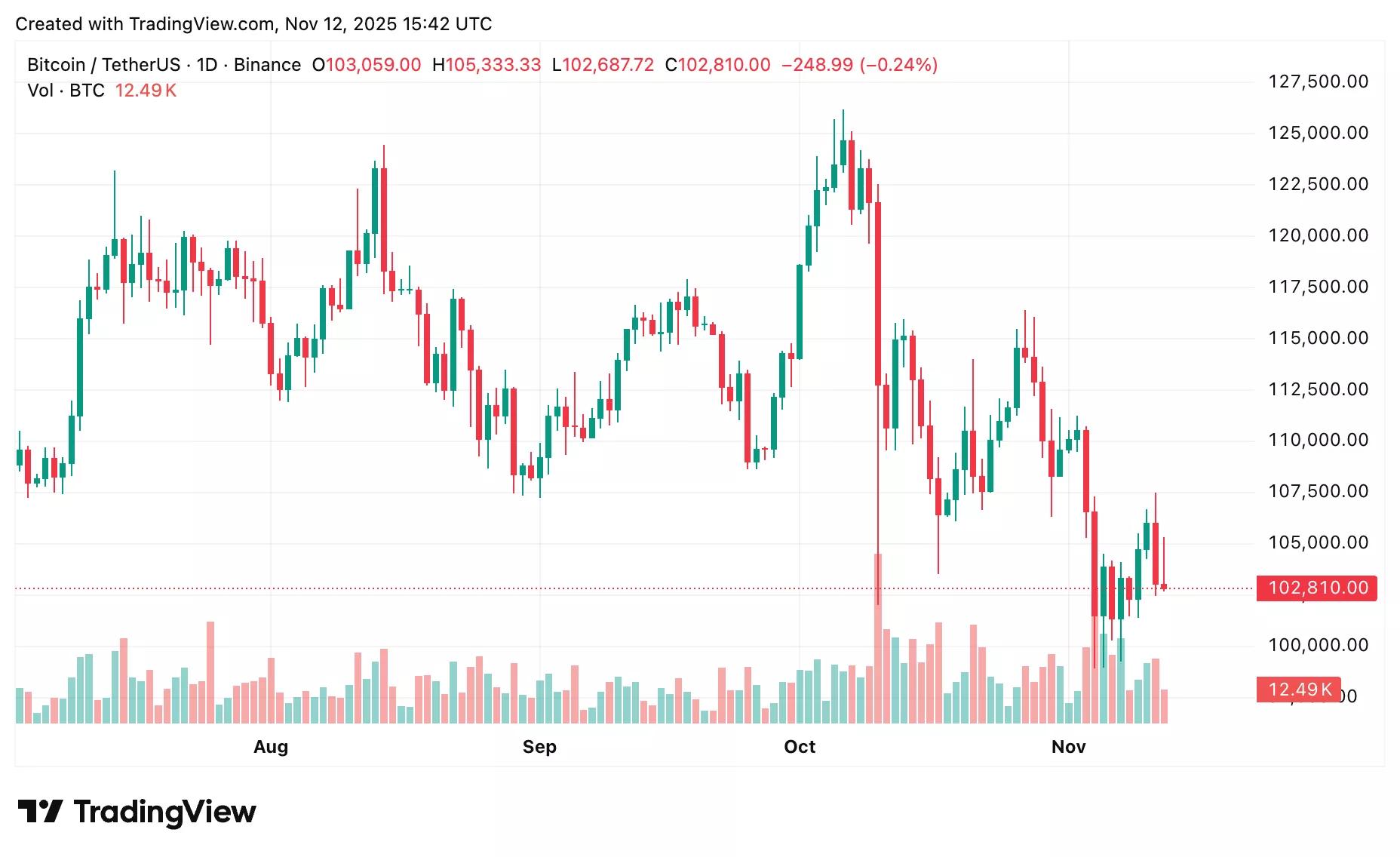- 比特币价格一直在 10.2 万美元至 10.7 万美元之间波动,波动性较低,每日波动幅度也不大,这表明比特币正处于盘整期。