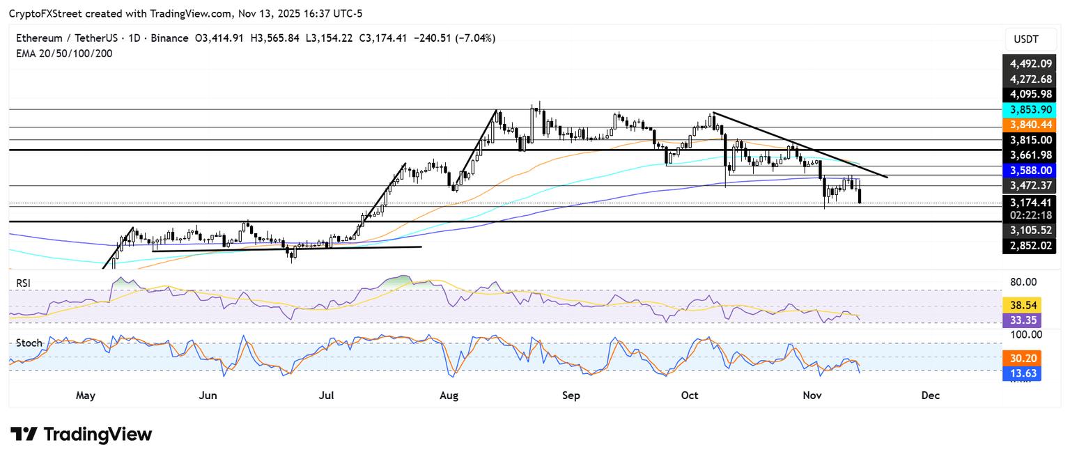 - 如果以太坊 (ETH) 跌破 3100 美元的支撑位,则有跌至 2850 美元关键水平的风险。