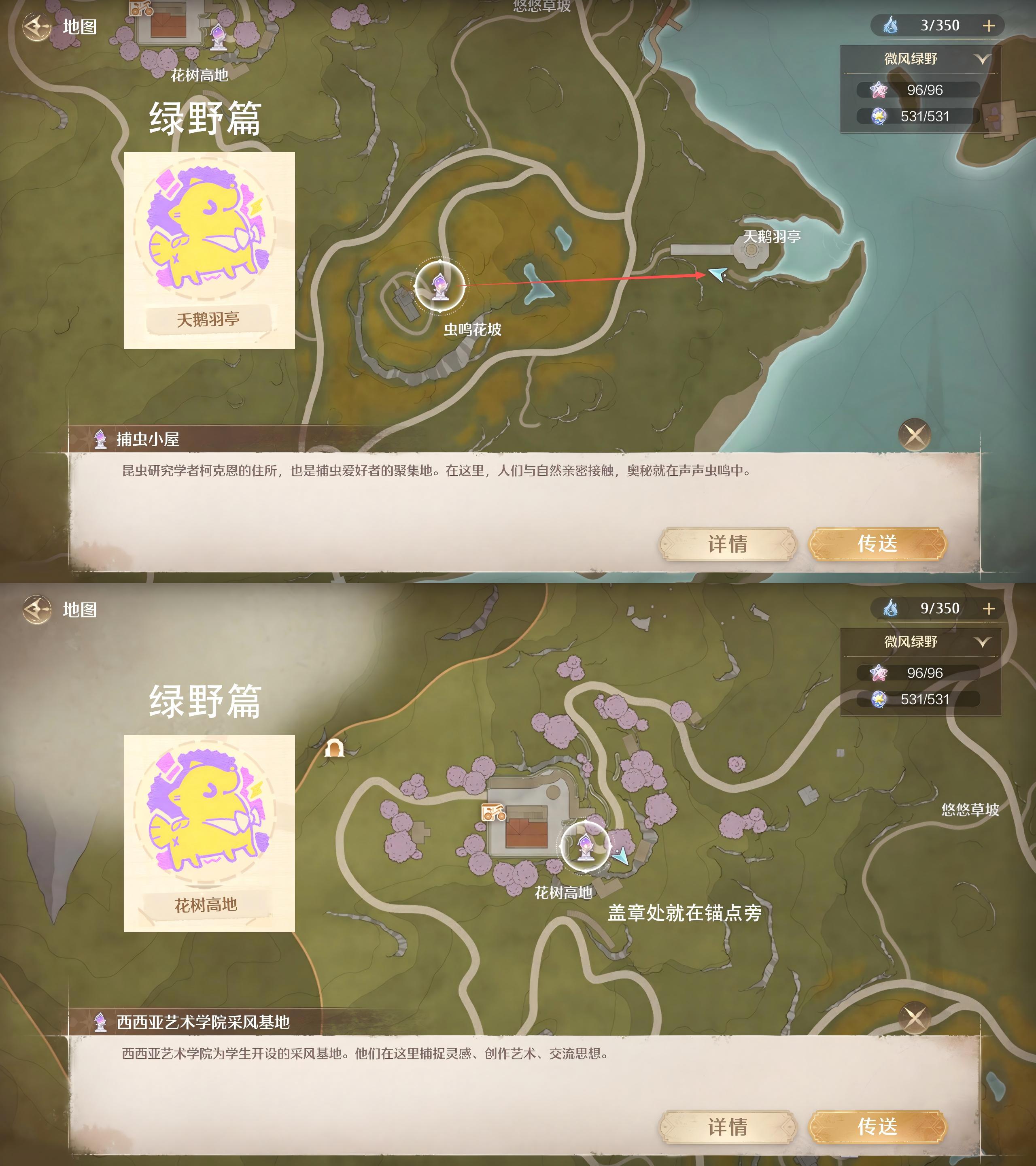 传送到锚点【捕虫小屋】后,盖章处在东方的天鹅羽亭附近;