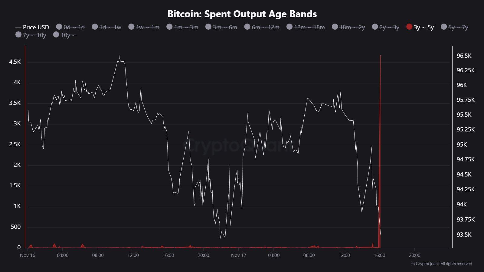 分析师指出:“4668枚存放了3-5年的比特币刚刚被消费出去——这明显表明休眠供应正在被激活。” 休眠账户的资金流动通常是抛售的信号。