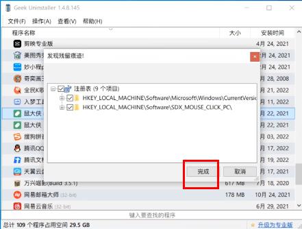 7、这时扫描发现有注册表残留,选中注册表点击"完成"就可以删除了。