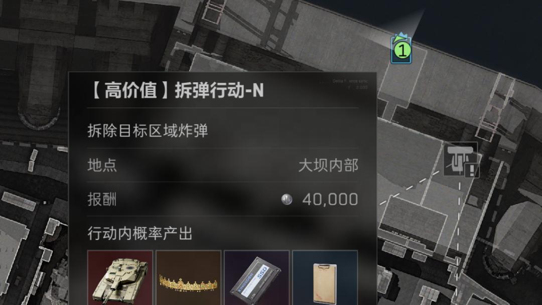 - 拆弹行动-N:接取点位于大坝北部的地下金库内,从行政辖区绳降后直线进发效率最高。
