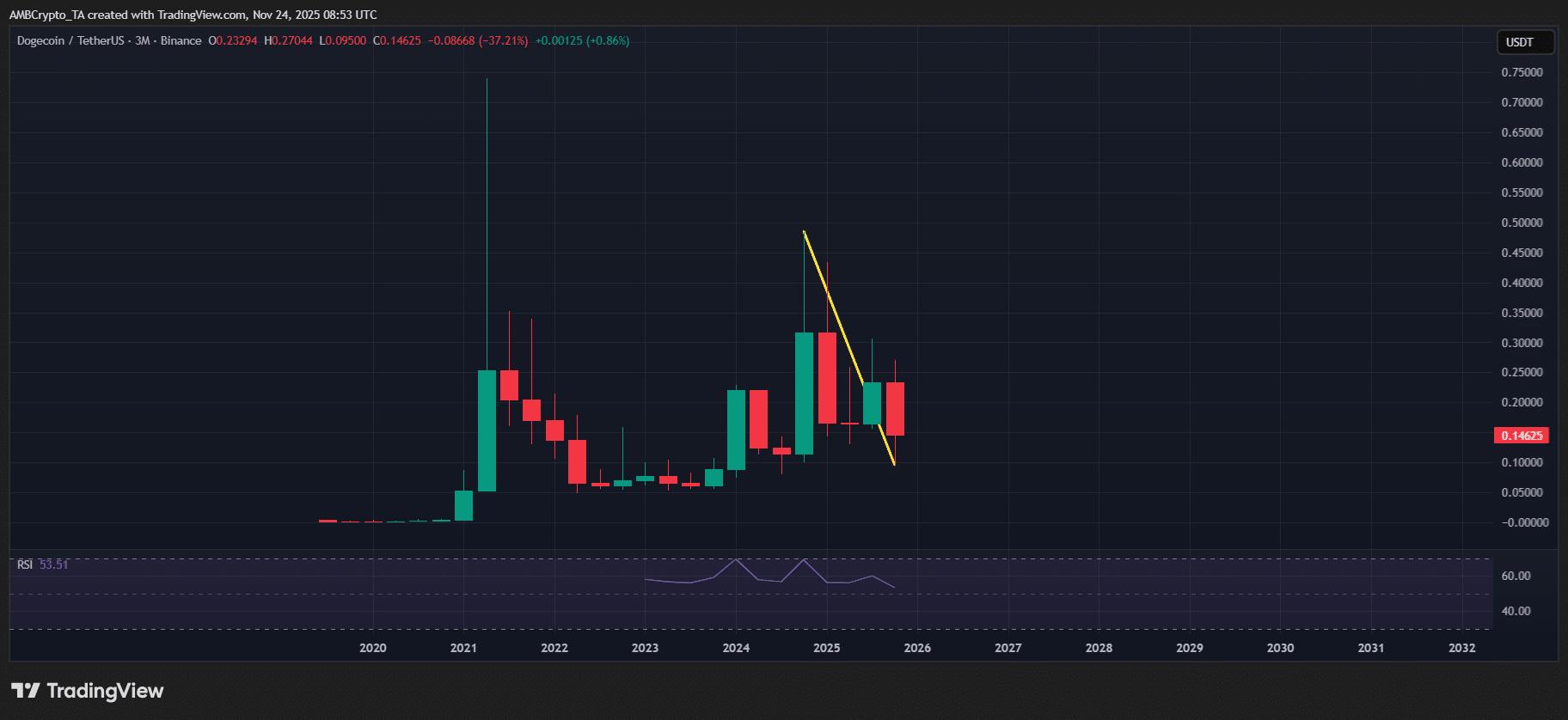 然而,技术面依然疲弱。狗狗币尚未收复第一季度的失地,反而进一步远离1美元的目标价位,每个季度都创下更低的低点,最近的最低点触及0.09美元,凸显了持续的波动性。